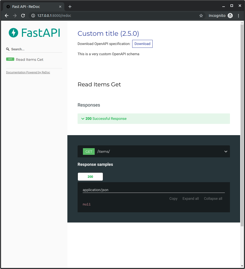 For example, let's add ReDoc's OpenAPI extension to include a custom logo.